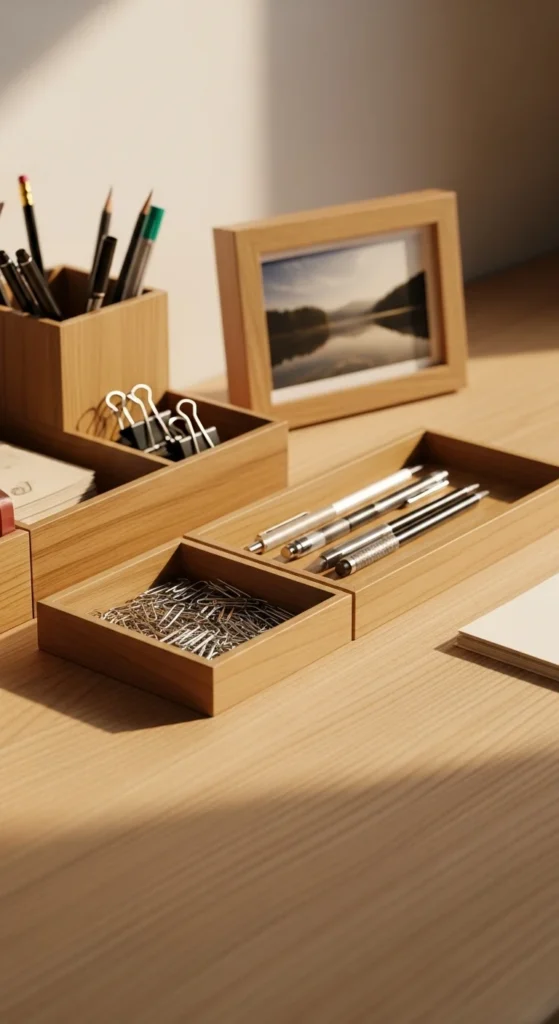 Clear organizers help you store items while keeping the surface visually light. Glass or acrylic pieces work well because they don’t add visual weight. Use them for pens, paper clips, cards, or USB drives. If you prefer a hidden look, place the organizer inside a drawer. Many affordable sets are available online. If you enjoy crafting, repurpose a candle jar by cleaning it thoroughly. Clear organizers pair well with neutral decor and add a tidy, polished touch to your desk. They help prevent small items from scattering across the surface.