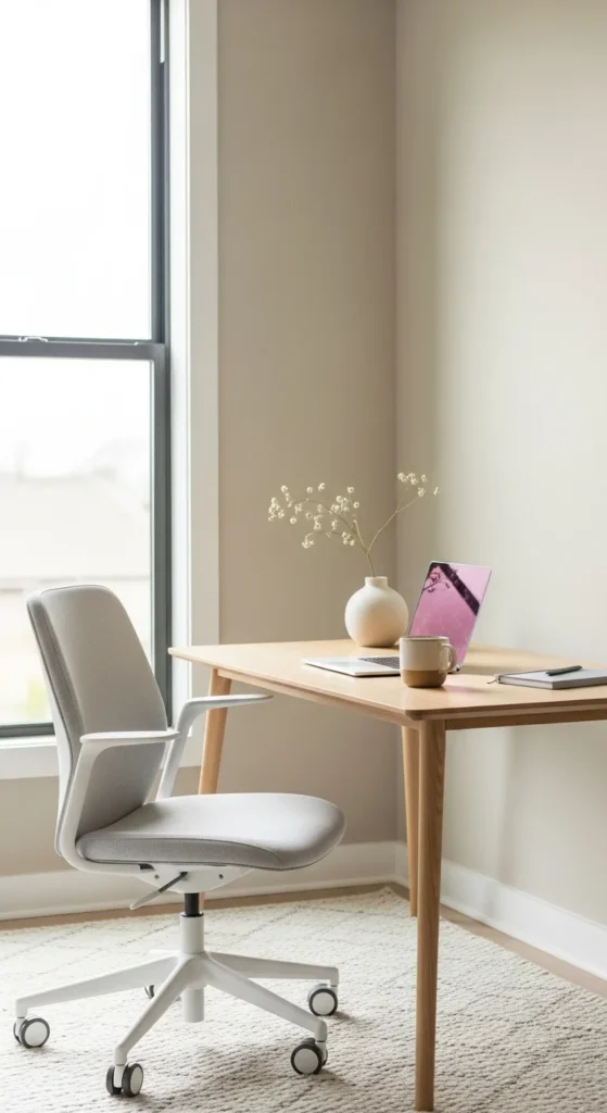 Neutral colors help create a peaceful atmosphere. Shades like cream, taupe, white, or soft gray can make a small office feel open and balanced. You don’t need to repaint the entire room. Start by updating smaller pieces: a neutral desk mat, seat cushion, or curtains. Even replacing bold-colored accessories with softer tones can change the mood. If your walls feel busy, try adding a neutral canvas or framed print to soften the area. Neutral tones pair well with wood, black metal accents, and greenery. To add depth, mix textures—linen, wool, or matte ceramic items. If your office feels too plain afterward, add one or two accent pieces like a clay vase or a slate-colored lamp. The goal is to let your eyes rest instead of being distracted by many competing colors. This palette works well in both small and large spaces.