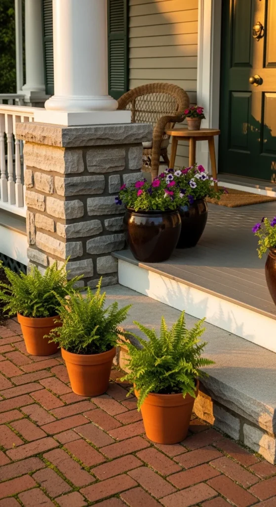 Adding natural stone or brick instantly gives your porch timeless appeal. You can use peel-and-stick stone panels for an affordable update. If you already have brickwork, highlight it with neutral paint or soft outdoor lighting. The texture makes your entrance feel grounded and elegant.