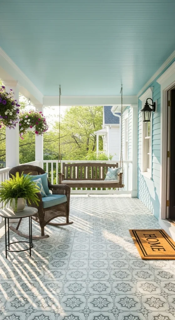 Add personality from top to bottom. A sky-blue ceiling gives an airy feel, while stenciled floors create pattern and charm. Use outdoor-grade paint and sealant to protect your work. This creative touch surprises guests and makes your porch one of a kind.