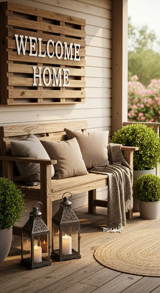 Wood adds warmth and natural charm. Incorporate wooden decor like benches, crates, or handmade signs. A reclaimed-wood welcome board or ladder shelf brings character without being expensive. Seal or stain the wood to protect it from weather damage and keep that rustic look intact year after year.