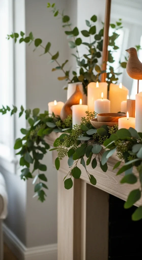 Fresh greenery works well for any season. Place eucalyptus, olive stems, or mixed foliage across your mantel to add texture. Keep the setup simple so it stays calm and balanced. Use small candle holders or a few wooden pieces to add height. Faux greenery works if you want something long-lasting. For a budget option, trim branches from your garden and mix them with thrifted ceramic pieces. This style stays clean and neutral, letting you adjust the look easily with small seasonal items as months change. Add tiny pinecones in winter, dried flowers during summer, or berries in fall for a quick update.