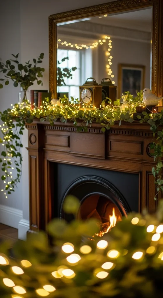 String lights add charm without feeling overwhelming. Wrap them around greenery or place them loosely across the mantel. Warm white lights create a peaceful atmosphere. Battery-operated strands keep the area tidy. Combine with candles for winter, or mix with faux leaves for fall. This idea is affordable and works even in small spaces.