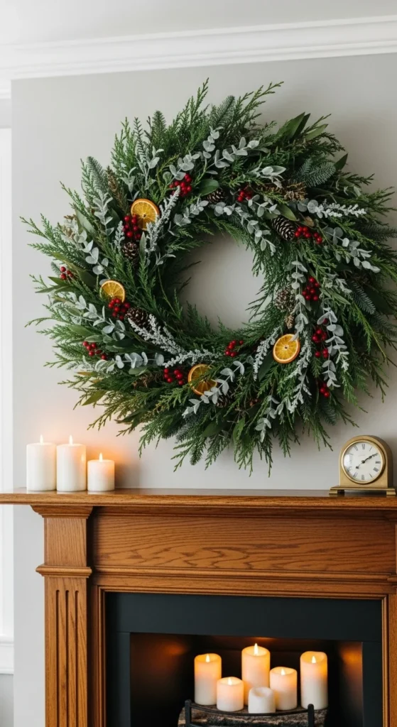 Hang a wreath above your fireplace to anchor the room. Choose natural greenery for spring, citrus and florals for summer, muted tones for fall, or snowy branches for winter. You can craft your own wreath using a wire base and stems from a craft store. Swap details seasonally—small berries, ribbon, or tiny ornaments. It creates a strong focal point without making the mantel crowded.