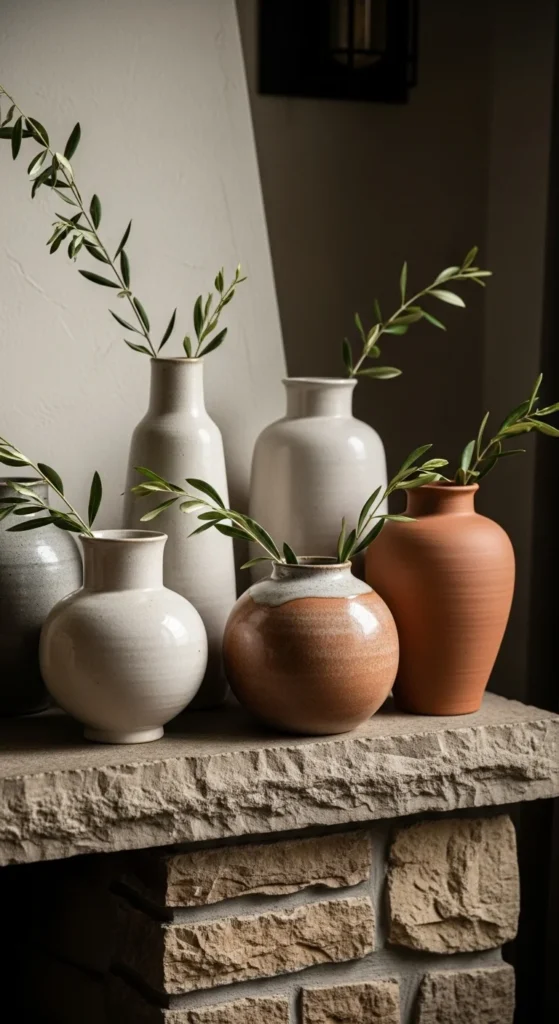 Use vases with different shapes and textures for a clean, styled look. Mix matte ceramics, glass, and stone. Fill them with branches or seasonal stems. Neutral vases are easy to reuse all year. Rotate the stems for seasonal changes—blooming branches in spring, greenery in summer, wheat in fall, frosted stems in winter. Check thrift stores for budget-friendly vase finds.