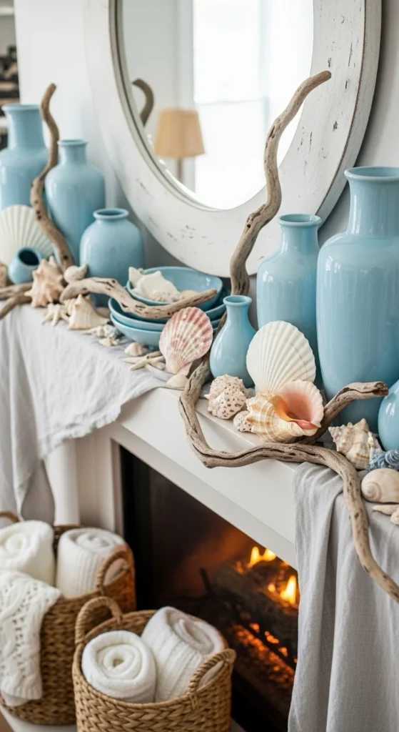A coastal look brings a light and airy mood. Add driftwood, soft blue pieces, and simple shells. Keep the palette pale—light gray, white, and sand colors. Use rope accents or woven textures for depth. This style works well for the warmer months. Collect shells from your trips or buy inexpensive sets online.