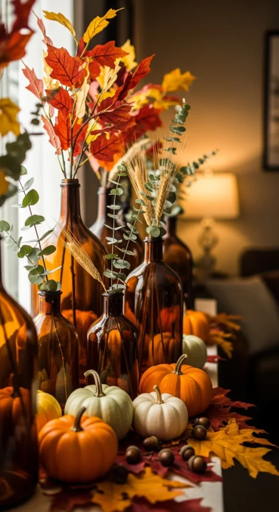 Use deep oranges, ambers, and soft browns to bring fall indoors. Add dried leaves, mini pumpkins, and amber glass bottles. Keep the arrangement loose and natural. You can gather leaves from outdoors and dry them between books. Place them around candles or vases. Mix wood textures to make the space feel warm without going overboard.