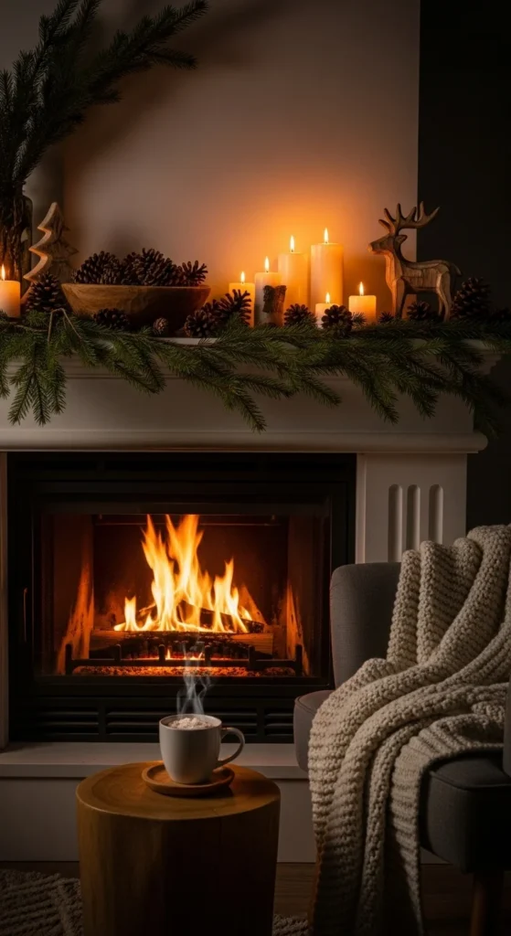 A minimal setup keeps the fireplace feeling bright. Use a small number of items—maybe two candles, a ceramic vase, and a small branch. Stick with whites, soft grays, or other light colors. This approach works for modern and Scandinavian-style homes. Choose shapes that feel soft so the space stays inviting. You can swap the greenery each season without changing the rest.