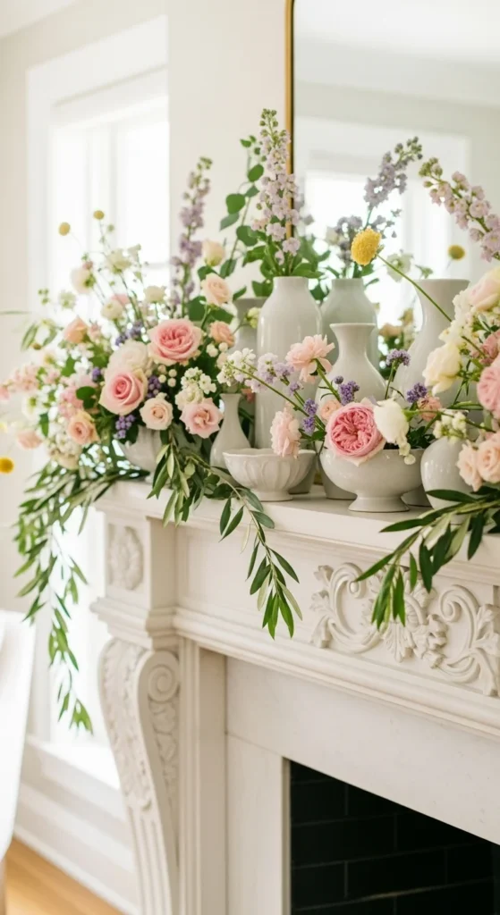 Pastels bring a soft feeling to your living room. Use blush pink, lavender, mint, or baby blue accents. Add small floral vases or a simple garland to the mantel. Keep the shapes delicate. You can buy inexpensive faux florals and mix them with real stems. Rotate tiny accents like ribbons or candles to keep the look fresh through spring.