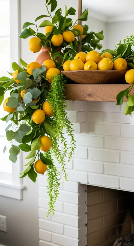 Use citrus elements for a bright summer vibe. Display real or faux lemons in bowls. Add citrus branches or greenery to soften the scene. Mix in white or glass pieces so the colors stand out. This setup is cheerful and easy to recreate with grocery-store lemons and thrifted bowls.