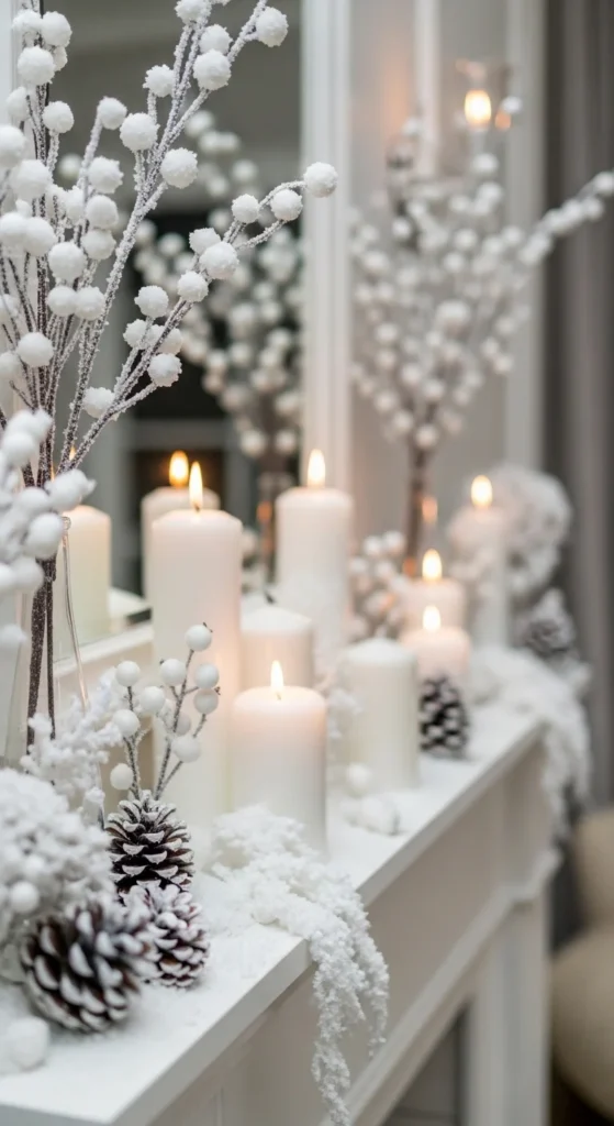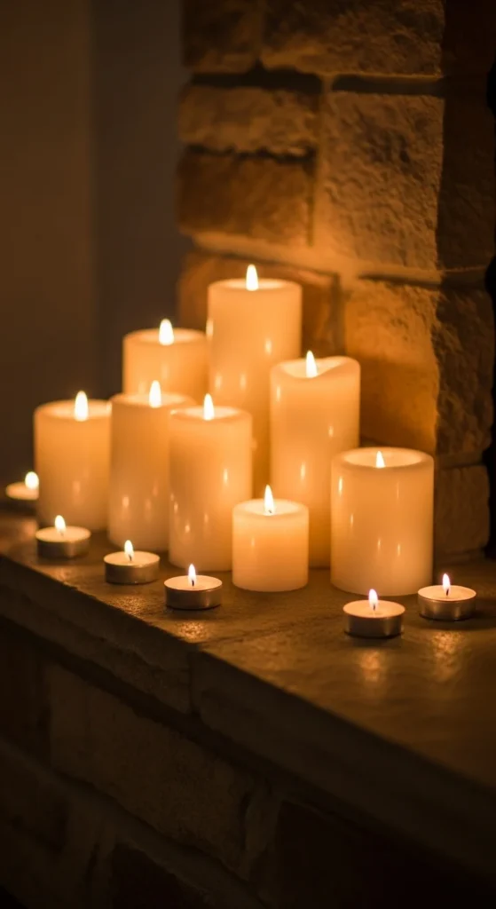 Candles instantly make a space feel warm. Group several pillar candles together in different sizes. Use white or cream for a clean look, or choose seasonal colors like deep red, amber, or frosted blue. LED candles work well if you want something safe. Place the candles on a wooden board or stone tray to anchor the arrangement. For a budget-friendly option, combine candles you already have. Scatter small glass holders to reflect extra light.