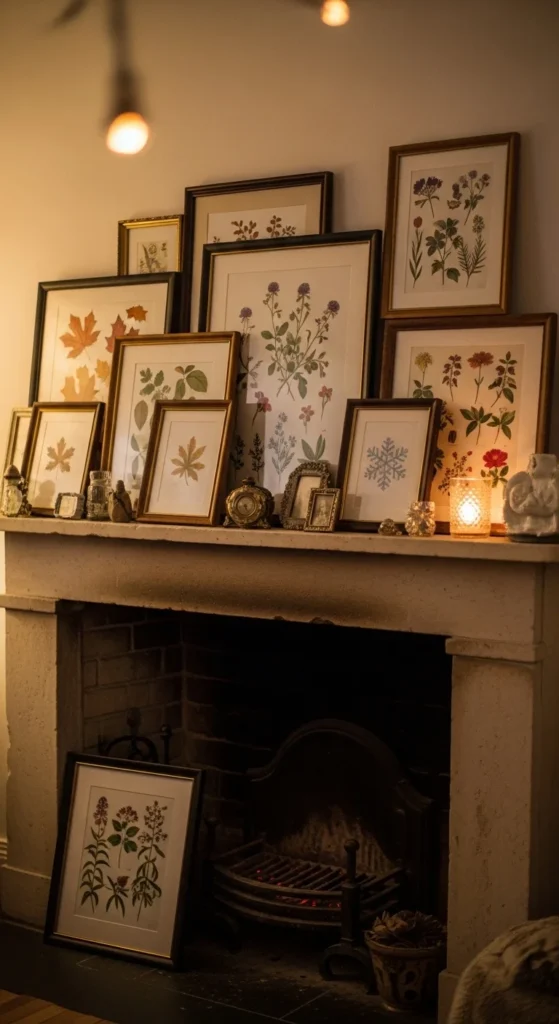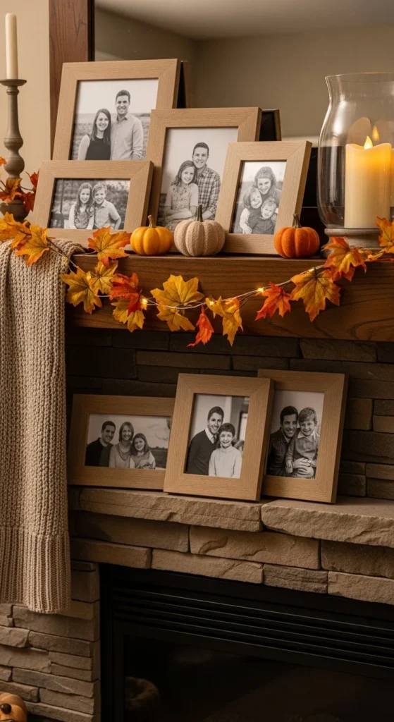 [Image Prompt: A mantel with family photos in matching frames surrounded by soft seasonal décor. Shot with a high-end camera. No text.]