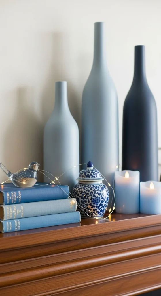 Pick a color theme—like blues, greens, or earthy tones—and decorate only with items in that palette. This creates a consistent, easy-to-style look. Add vases, small objects, candles, or greenery that match the color family. This idea works year-round because you can swap out colors when the season changes.