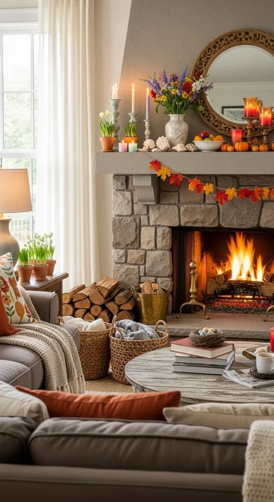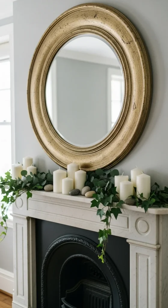A mirror above the fireplace brightens the room by reflecting light. Choose a round or arched shape for a soft look. Place candles, greenery, or small decorative items under it. This setup works well for any season because the base stays simple. Change the accents around the mirror as seasons shift—greenery in spring, shells in summer, warm-toned florals in fall, or twinkle lights in winter.