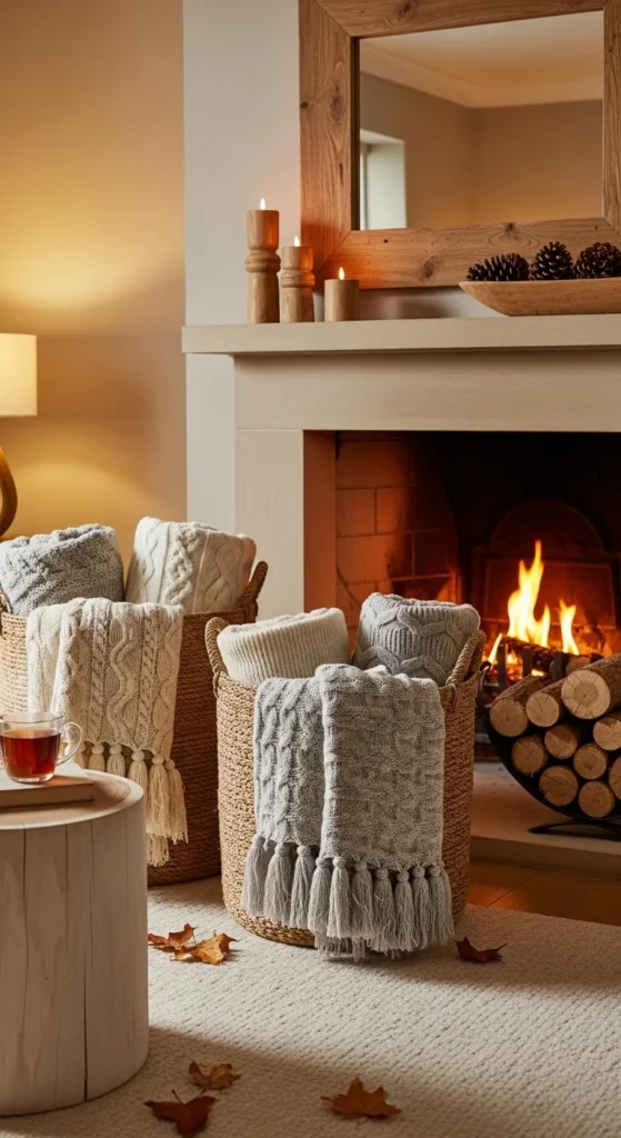 Placing baskets beside the fireplace adds warmth and texture. Fill them with rolled blankets or seasonal pillows. Woven textures feel inviting year-round. Try mixing two sizes of baskets to create more dimension. You can add dried branches, faux logs, or small seasonal stems inside them. Thrift stores often have affordable baskets you can spray-paint for a quick refresh. This setup works great in small living rooms because it keeps the area functional yet stylish.