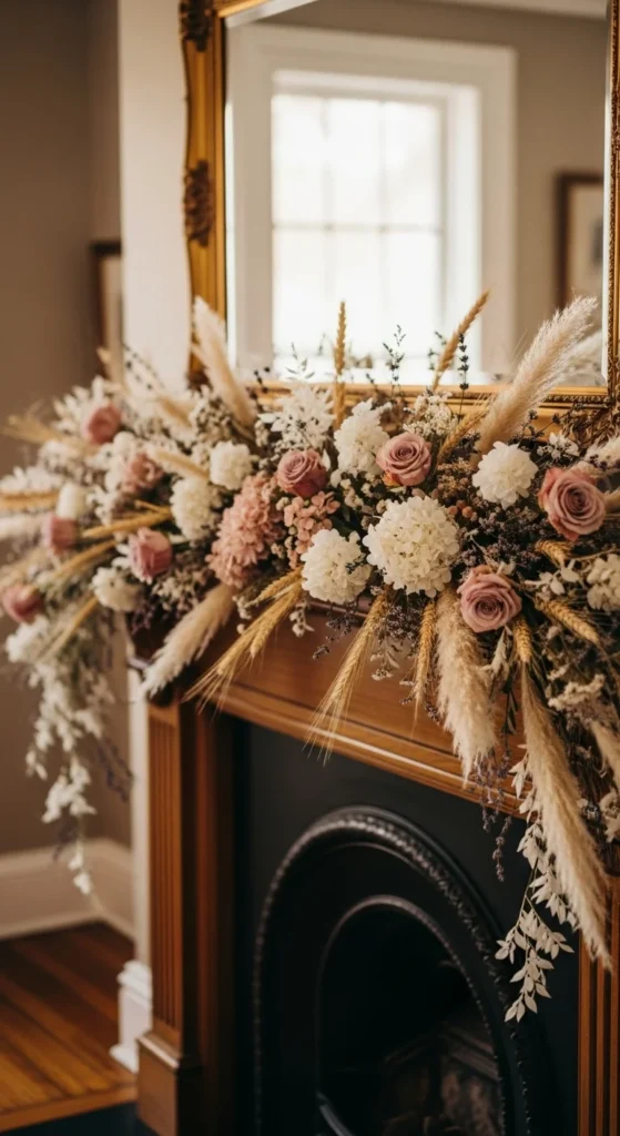Dried florals feel warm and natural. Use wheat stems, pampas grass, or dried hydrangeas to craft a garland. You can make your own by tying small bundles together with twine. The colors stay soft and muted, fitting any season. Add small accents like votive candles or wooden beads to finish the look. Dried stems last for months, saving money in the long run. Rotate the flowers based on the season for simple updates.