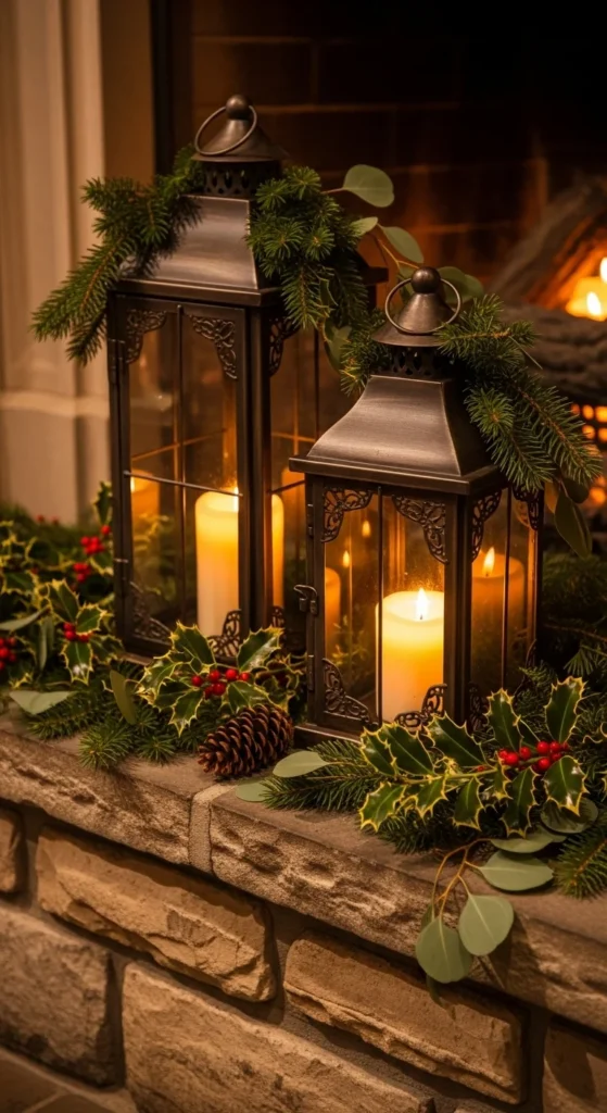 Lanterns create a warm glow beside your fireplace. Choose metal, wood, or glass styles depending on your room. Fill them with LED candles for convenience. Add small seasonal touches—pine for winter, citrus branches for summer, small pumpkins for fall. Lanterns from discount stores look great once cleaned and styled. Place two on each side for balance.
