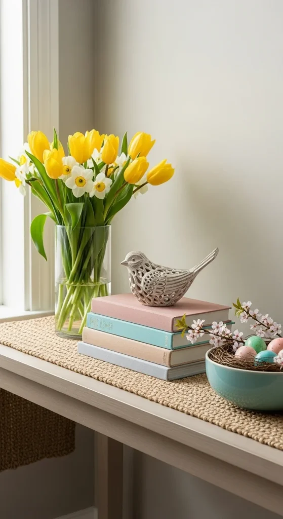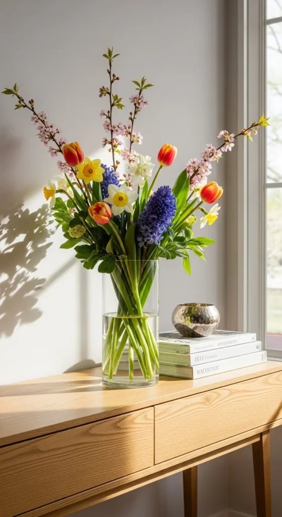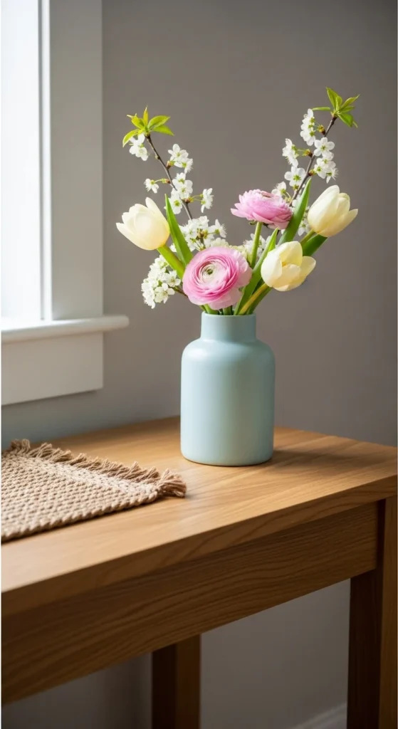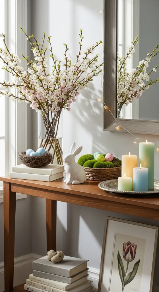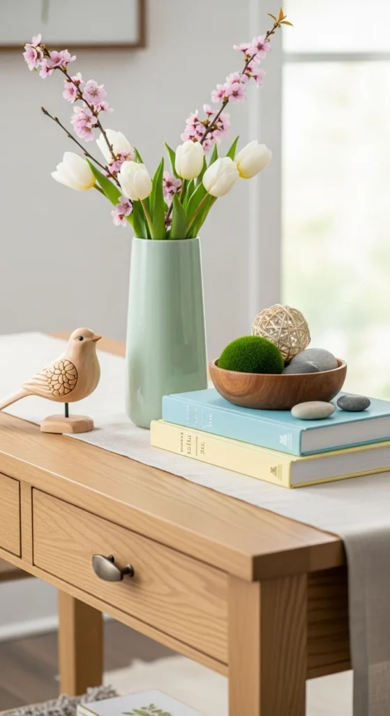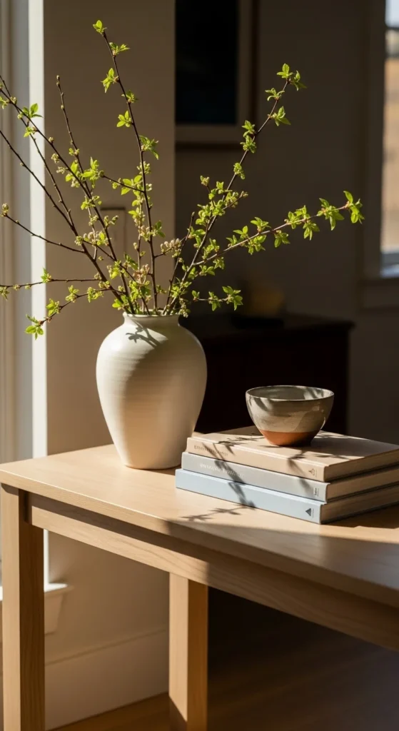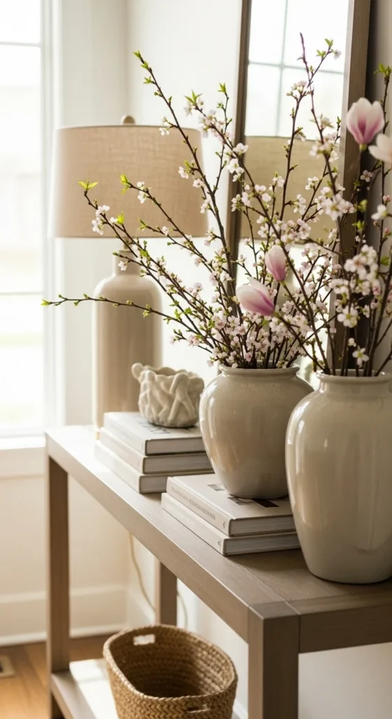 A single neutral vase with seasonal branches is one of the easiest ways to style a console table for spring. Choose ceramic, stoneware, or clear glass in soft tones. Add faux or real branches like cherry blossom or eucalyptus. Keep the height balanced so it doesn’t overwhelm the table.