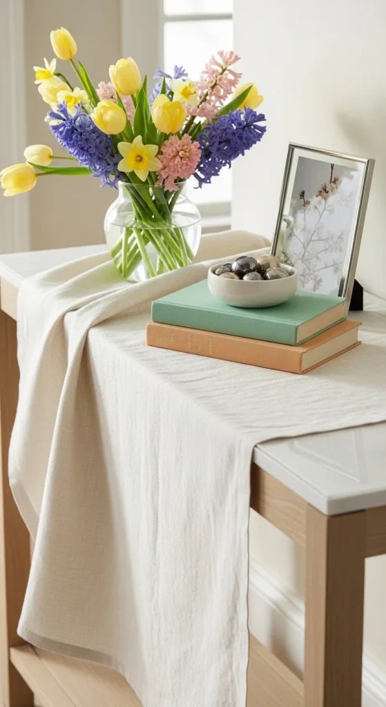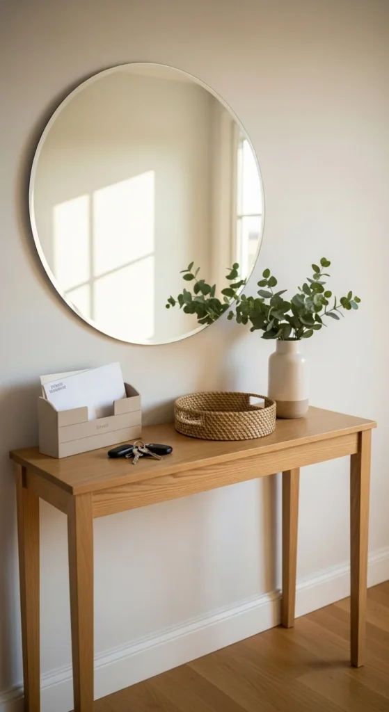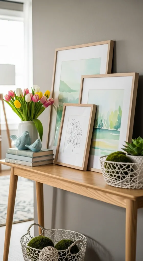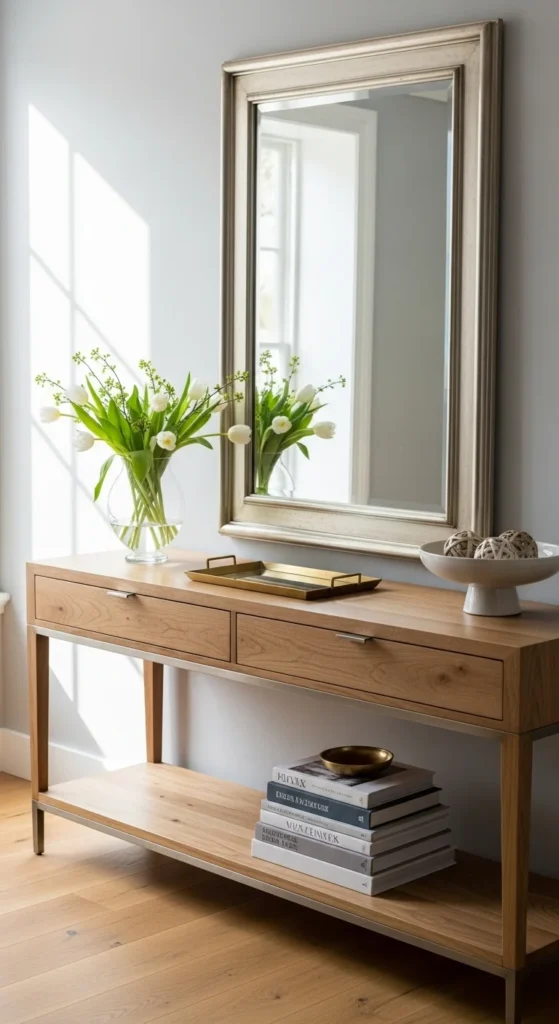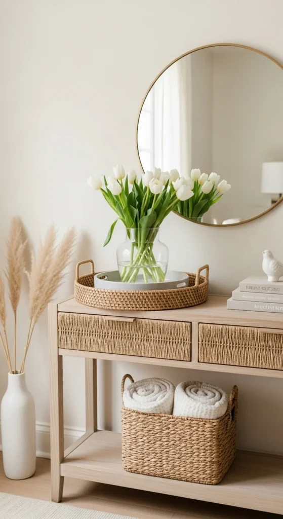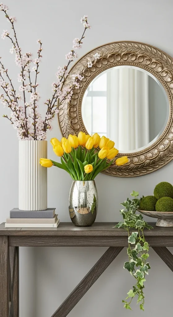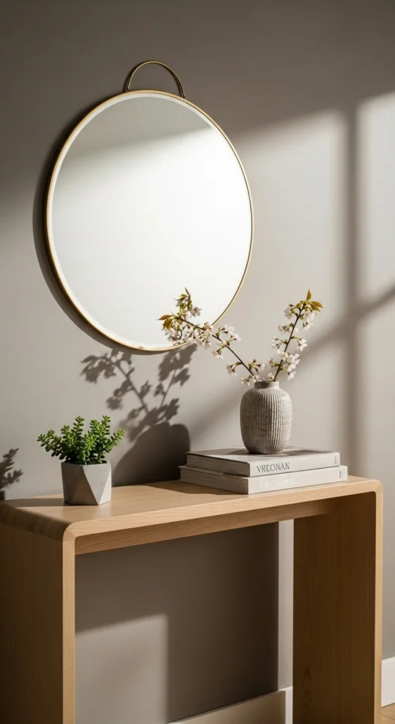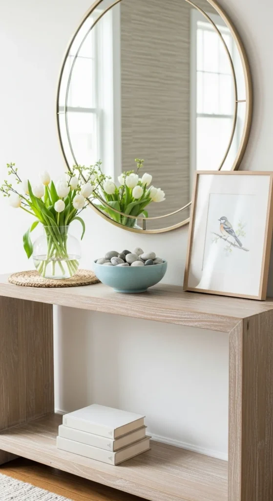 A mirror above a console table reflects light and makes the space feel open. Round mirrors or soft shapes work especially well for spring.