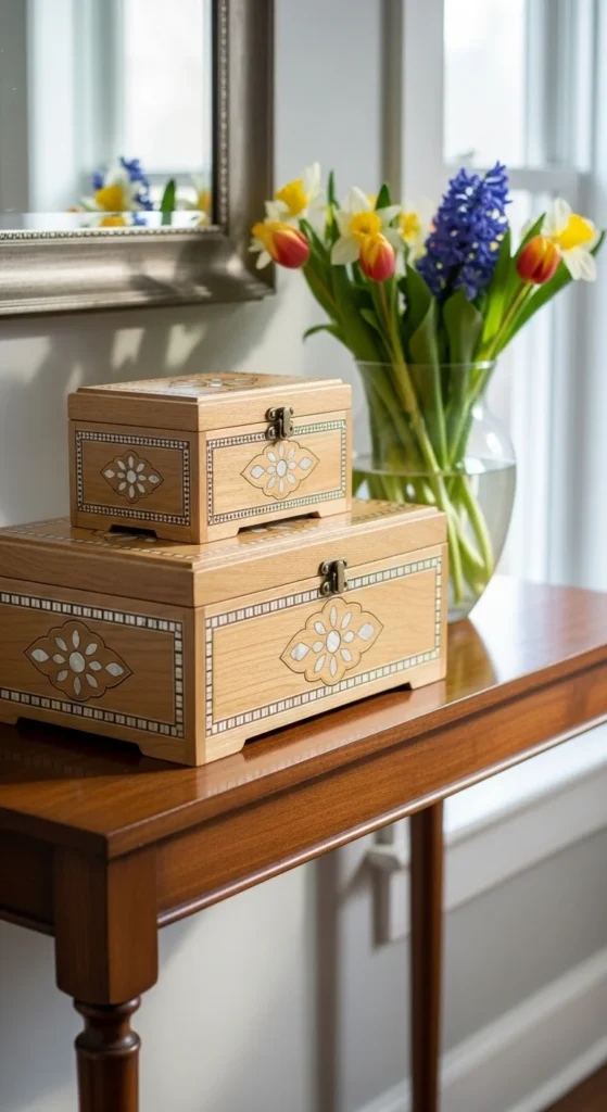 Light wood decor fits spring styling well. Trays, beads, or small frames work nicely and transition easily between seasons.