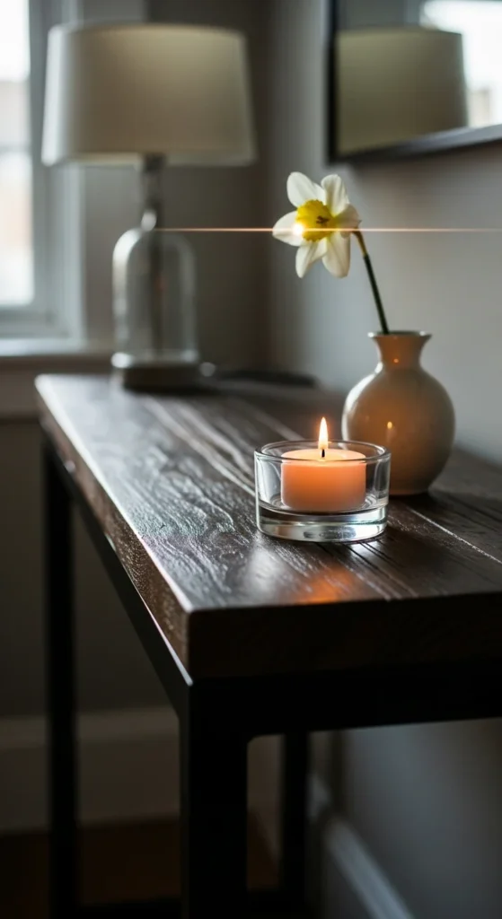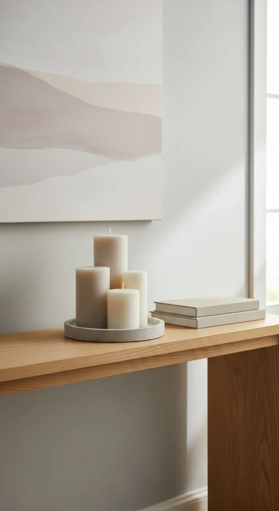 A candle adds warmth without taking up much space. Use neutral holders and keep the height low so it doesn’t block other decor.