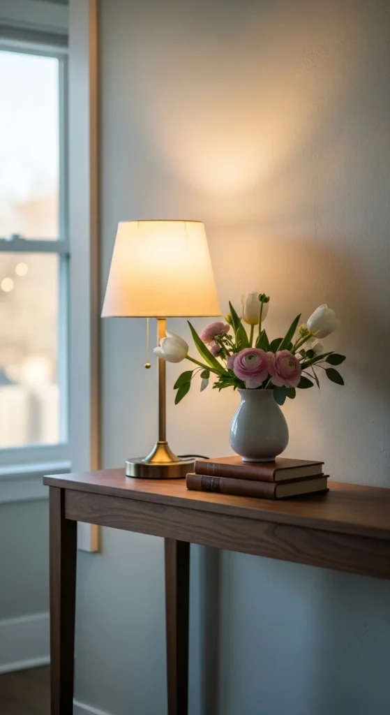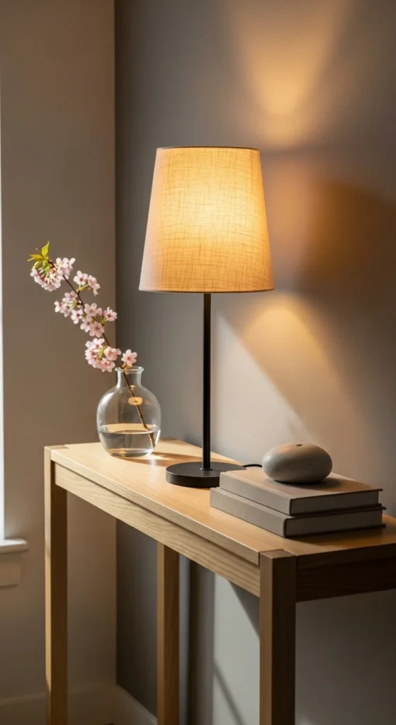 A slim table lamp adds warmth and function without crowding the surface. Look for narrow bases and soft fabric shades in off-white or beige.