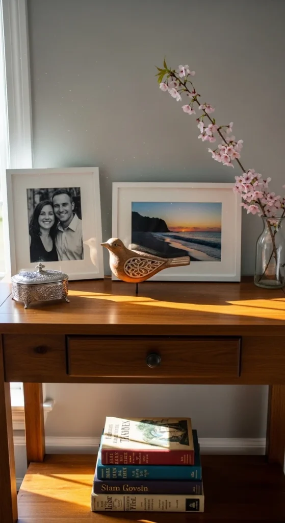 Personal items make the space feel lived-in. Limit them to one or two pieces and keep frames simple.