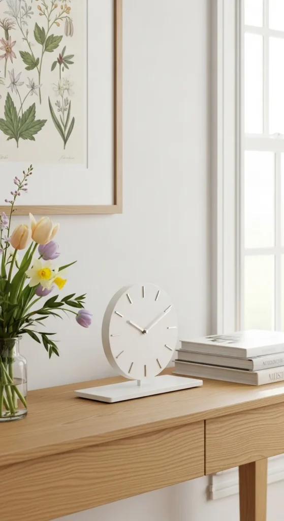 A small clock adds function and charm. Pair it with books or a plant for balance.