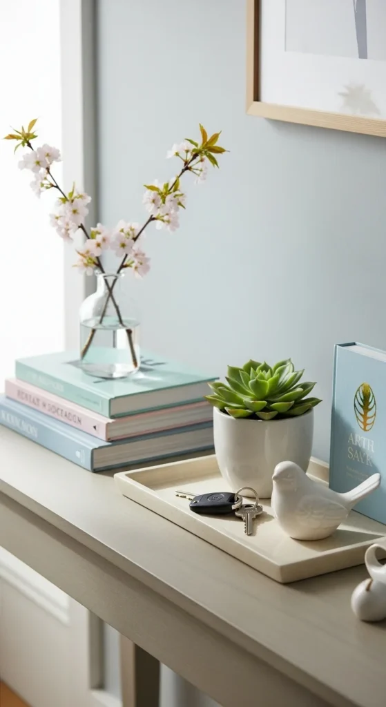 A shallow tray keeps everyday items contained while still looking styled. Wood, rattan, or ceramic trays work well for spring.