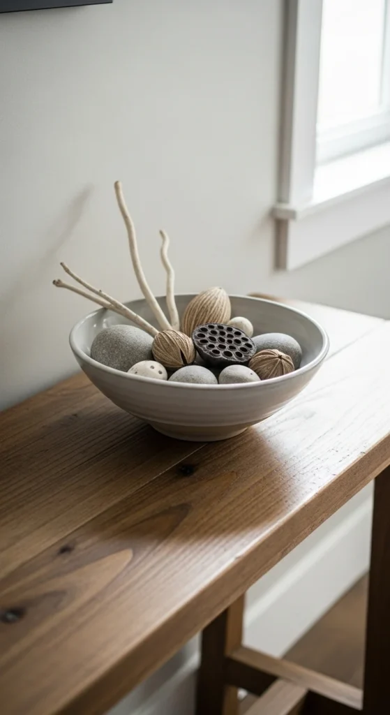 Place the bowl toward the front edge of the table so it doesn’t block other decor. This detail helps the console feel layered but not crowded.