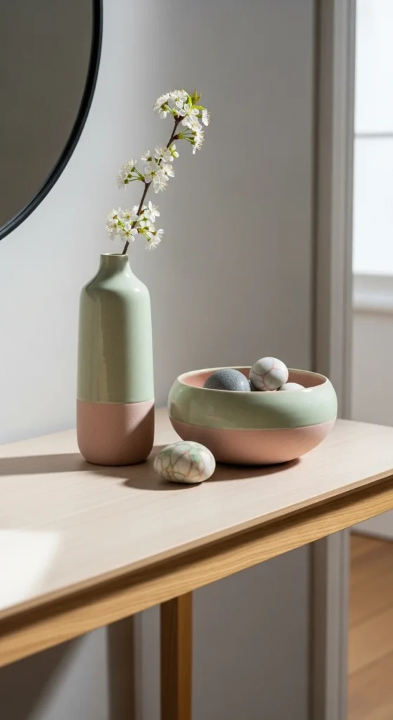 If you only have one ceramic piece, pair it with a small stack of books. Muted pastels or warm neutrals keep the look calm and seasonal.