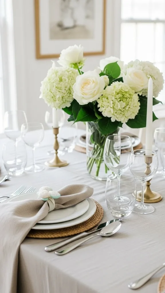 A neutral linen table setting looks calm and welcoming. Start with what you already have. Plain plates and simple cutlery work perfectly. Add linen napkins in cream, sand, or soft gray. If linen is out of budget, cotton napkins in similar shades give a similar look. Tie each napkin with jute twine and tuck in a small sprig of greenery from your yard or a low-cost bunch from the market. Keep the centerpiece low so people can talk across the table. Use a runner instead of a full tablecloth if you want to show off the wood. This setup feels special without a lot of extra items. It also works for everyday meals after the holiday, so nothing feels wasted. For a quick DIY, iron the napkins and fold them neatly. That small step makes the whole table look more put together.