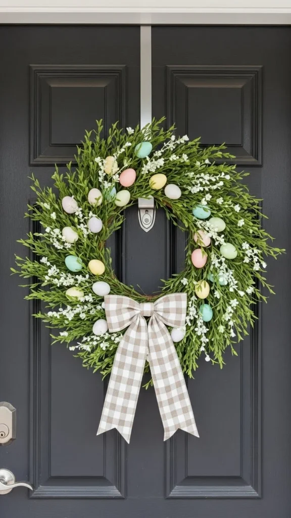 A wreath sets the tone before guests even step inside. Keep it light and simple. Use faux greenery and a few soft flowers. Add a small ribbon bow in a neutral shade. If you want a DIY option, start with a wire ring and wrap it with greenery stems. Secure them with floral wire or twist ties. Add a few eggs in muted colors if you want a small Easter touch. This kind of wreath works all spring, not just one weekend. After Easter, remove the eggs and keep the rest.