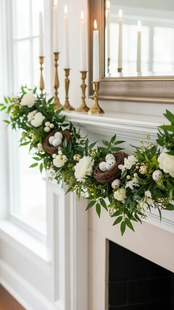 A garland across the mantel adds a spring look quickly. Use faux greenery or real branches. Drape it loosely for a relaxed feel. Add a few small eggs in neutral colors or tiny flowers tucked into the greenery. Keep it spaced out so it does not look crowded. If you have string lights, weave them in for evening glow. This garland can stay up through spring if you keep it mostly greenery. After Easter, remove the eggs and keep the rest for the season.