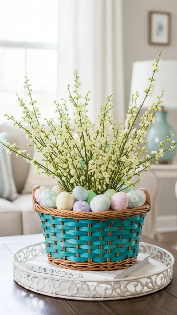 A small basket on a coffee table is an easy Easter detail. Fill it with a cloth napkin, a few eggs, and a small bunch of flowers. Keep the basket natural in color. This makes the setup look simple and neat. You can use a basket you already own, like one used for storage. This keeps spending low. After Easter, remove the eggs and keep the basket for blankets or books.