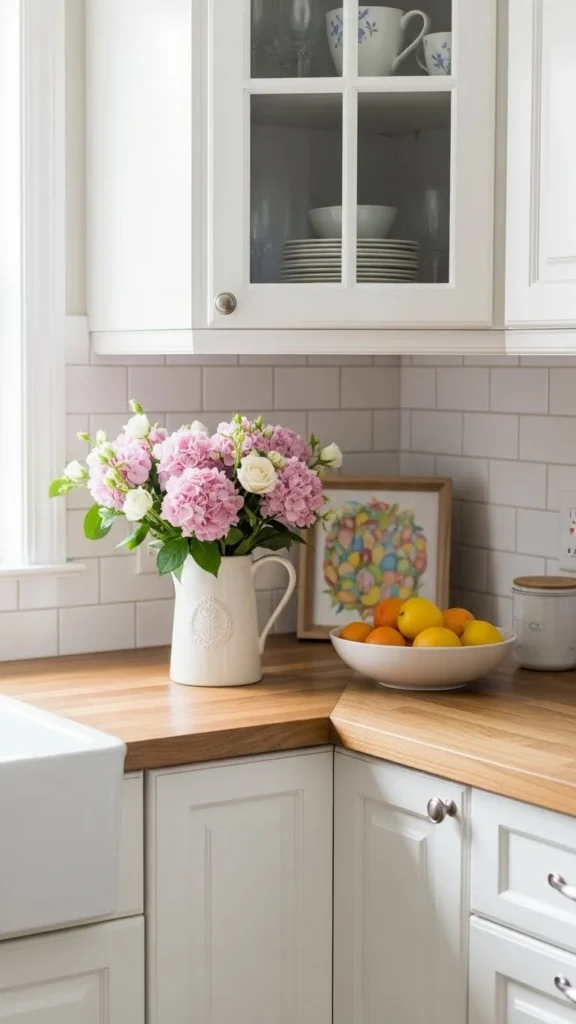 Not every home has room for big displays. A small counter corner can still feel special. Place a vase of tulips, a bowl of eggs, and a candle on a small tray. Keep the colors light. This setup takes only a small space but makes the kitchen feel seasonal. Use items you already have. A plate can work as a tray. This keeps the look simple and easy to clean up.