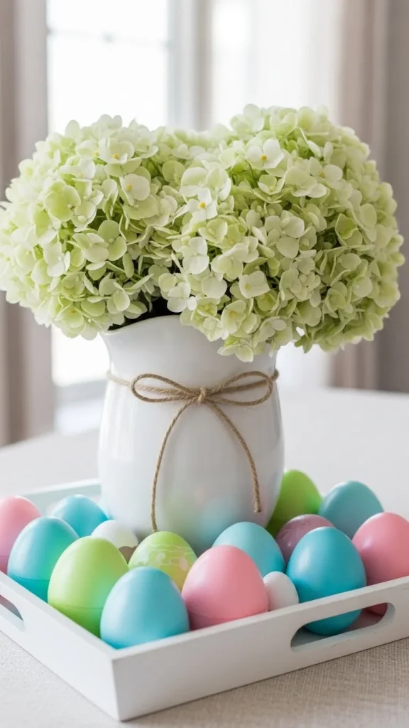 A tray makes decor feel neat and planned. Use a neutral tray in wood or white. Add three items only: a small vase, a candle, and a bowl of eggs. This keeps the look simple. Place the tray in the center of the table or on a sideboard. If you do not have a tray, use a large plate. The key is grouping items so the room looks tidy. This kind of tray setup works through spring if you swap the eggs for fruit later.