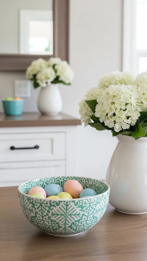 An entryway bowl is an easy way to greet guests with a seasonal detail. Use a bowl you already own. Fill it with eggs in soft colors and add a few sprigs of greenery. Place it on a small table or console. Keep the bowl simple so the items inside stand out. This setup takes little time and costs very little. It also keeps the decor contained in one place, which helps the home feel tidy. After Easter, swap the eggs for lemons or small flowers and keep the bowl as part of spring decor.