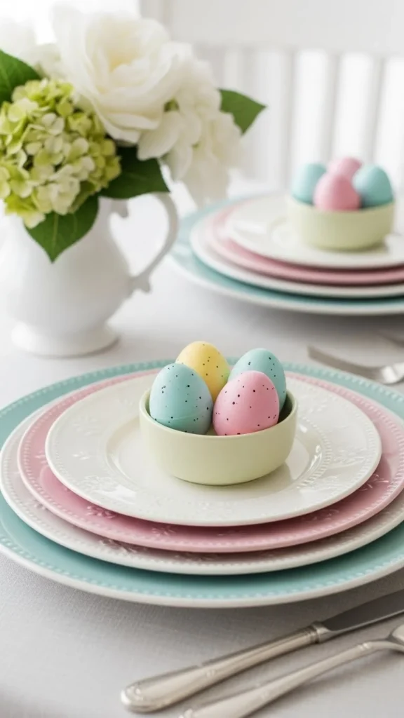 A ceramic bowl in a soft color can act as decor all on its own. Fill it with eggs, wrapped sweets, or small flowers. If you do not have a pastel bowl, use a white one and add pastel items inside. This keeps the look light. Place the bowl on a kitchen counter or coffee table. It makes the room feel seasonal without adding lots of small items. If you want a DIY idea, paint a plain bowl with a single coat of chalk paint. Let it dry fully before use. This gives you a custom look for very little cost.