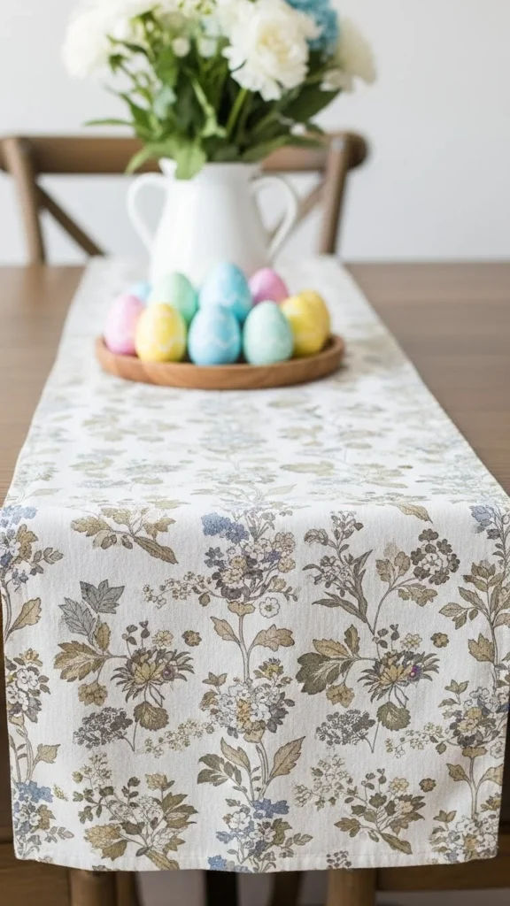 A runner makes the table feel styled without covering everything. Choose cotton in cream, light beige, or pale gray. If you do not want to buy one, use a long scarf or piece of fabric you already own. Iron it so it sits flat. That small step makes it look more polished. Place a simple centerpiece on top, like tulips or candles. Keep the runner simple so other decor can shine. A runner also works for everyday meals after Easter, so it is not a one-day item. If you want a small DIY touch, add a thin ribbon tie at each end.