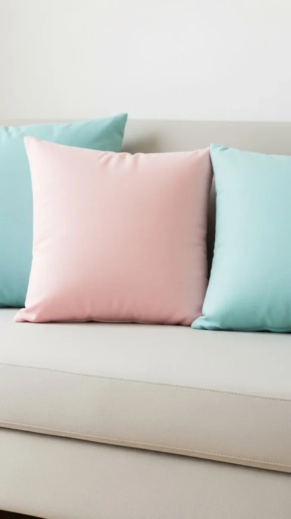If you already own neutral covers, keep them and only add two pastel ones. That small change is enough. Place the pillows evenly so the sofa looks styled, not random.
