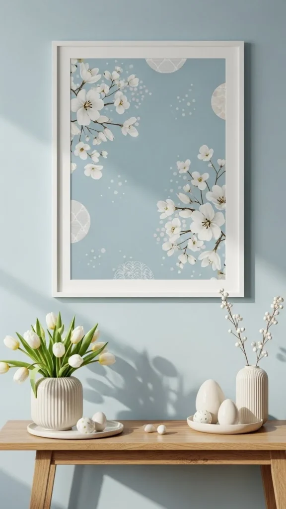 Add one spring-themed print instead of many small wall items. A single frame looks cleaner and keeps the wall from feeling busy. Choose a floral sketch, a simple pattern, or a minimal seasonal shape.