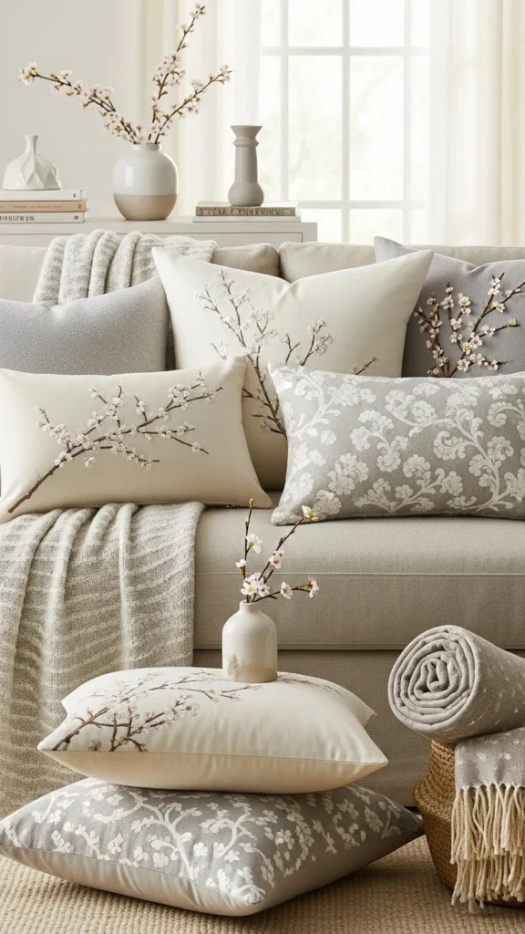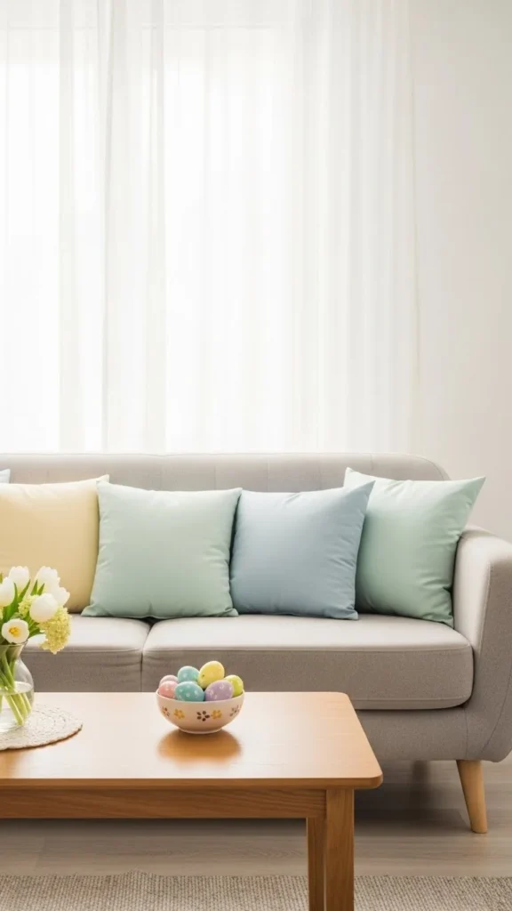 Changing cushion covers is one of the fastest ways to bring a spring holiday feel into a living room. Pastel shades like pale blue, blush, or light yellow add color while still feeling calm. The best part is you don’t have to buy new cushions. Just use the inserts you already own and swap the covers for a seasonal look. If you want to keep it tidy, stick to two main colors and one neutral, like cream or soft gray. That simple rule keeps the sofa from looking busy.