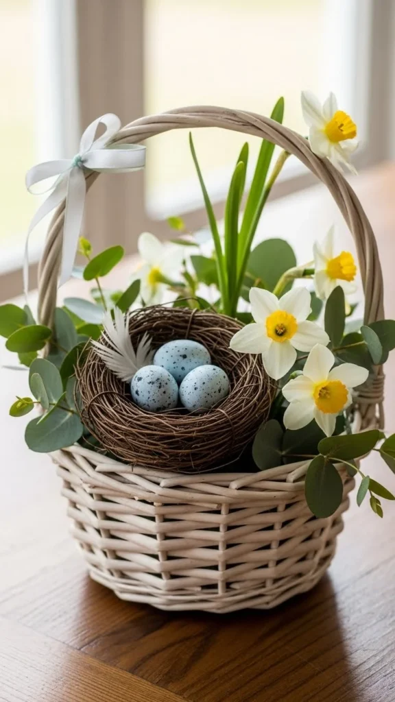 A small basket centerpiece keeps everything in one spot. Fill it with flowers, eggs, or a simple candle. Keep it low so it doesn’t block conversation during meals.
