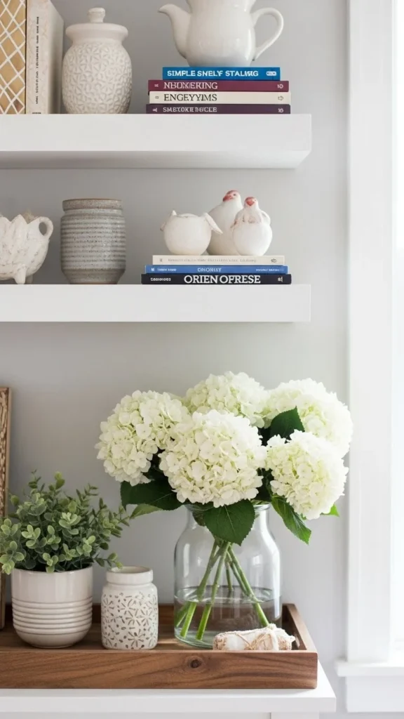 Shelves feel cluttered fast. Remove extra items and keep only a few pieces. A good rule is three items per shelf: one book stack, one small vase, and one seasonal accent.