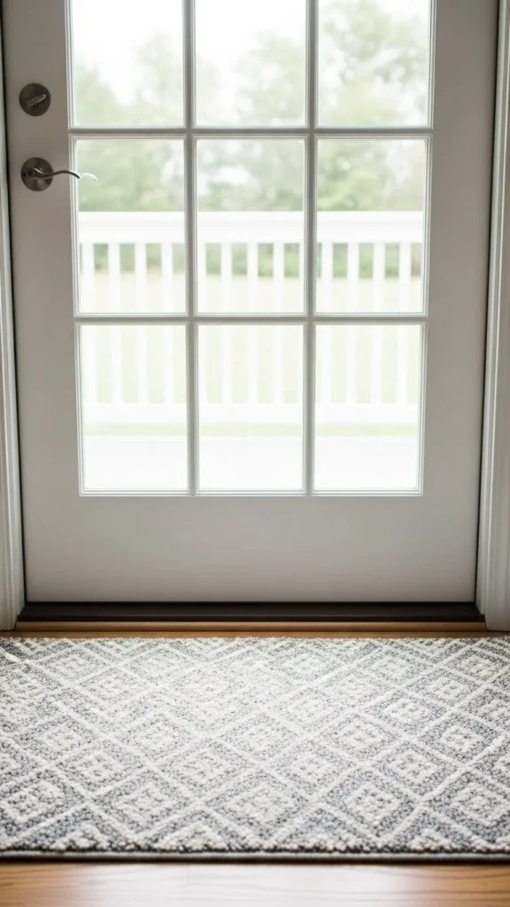 A light rug near the door makes the entry feel welcoming without adding objects on surfaces. Choose a rug that is easy to shake out and clean. Neutral tones look best.