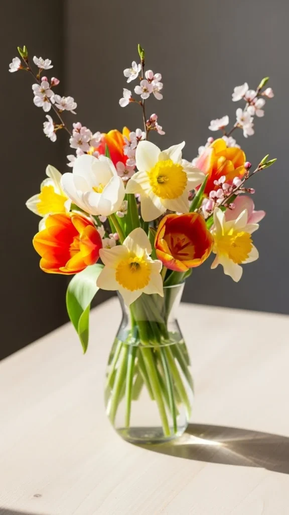 Place two bud vases on a windowsill, one on a coffee table tray, and one on a side table. That’s enough to carry the spring theme through the room. Keep the flowers simple. White blooms, small daisies, or soft pastel tulips work well. If you don’t want to buy flowers, use greenery from your yard or a few branches for a clean look. When the flowers fade, you can remove the vases quickly and wipe the surface clean. No extra decor remains behind.
