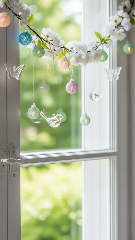Choose one small window detail, like a ribbon tie, a small hanging ornament, or a simple greenery strand. Keep it minimal so the window still looks clean.