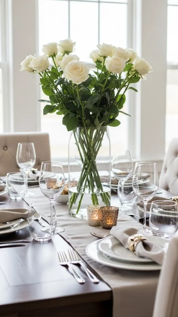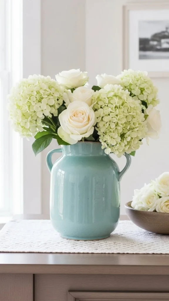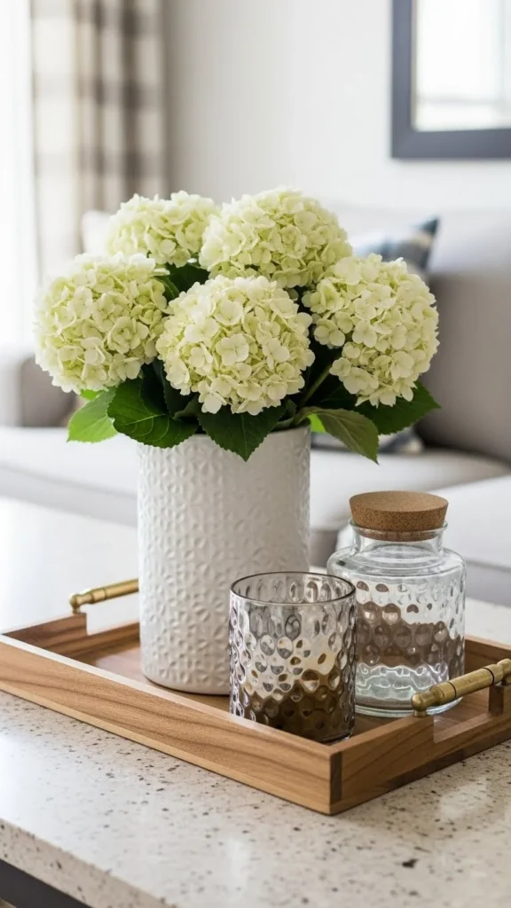 One vase with flowers can carry the whole holiday look. Choose a simple vase shape. Keep the flowers light and soft. Place it where people will see it, like a dining table or coffee table tray.