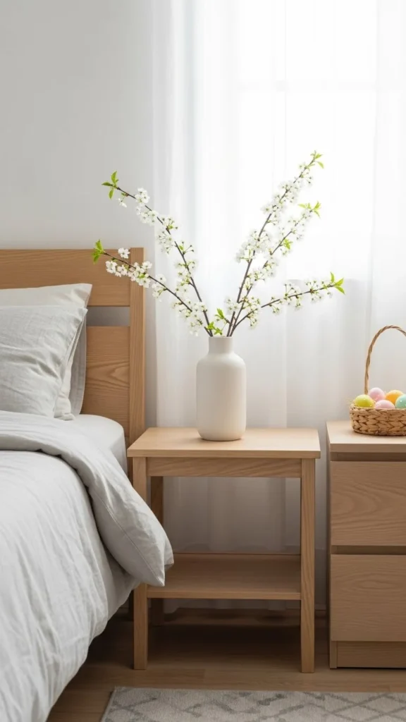 Add one small spring detail in the bedroom. A pastel pillow, a light throw, or a small vase on the nightstand is enough.